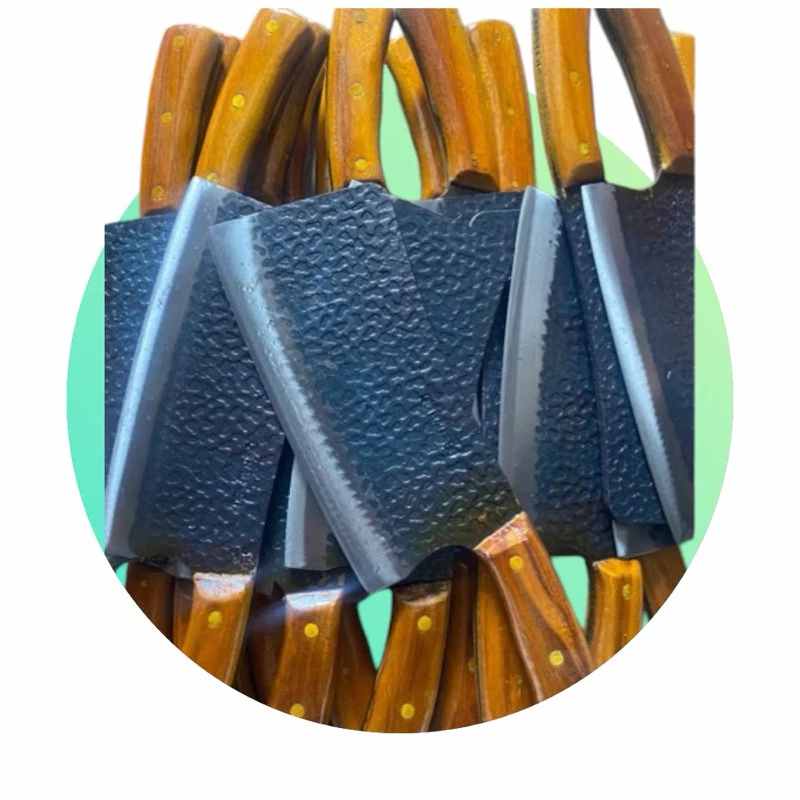 Dao chặt xương làm từ nhíp xe ô tô, nặng 800gram, bản 12cm, cán gỗ ốp 2 bên có chốt 3 đinh.