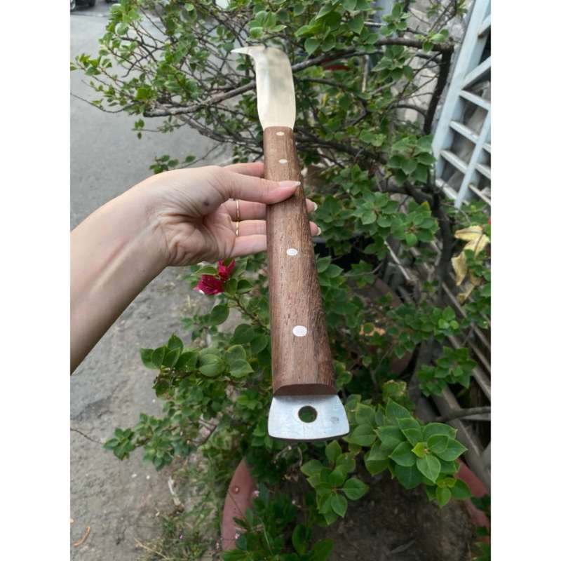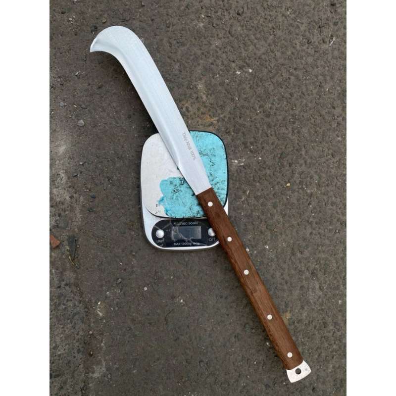 Lưỡi rựa đúc liền cán. 2 bên tay cầm ốp gỗ có chốt đinh bên siêu cứng và bền.